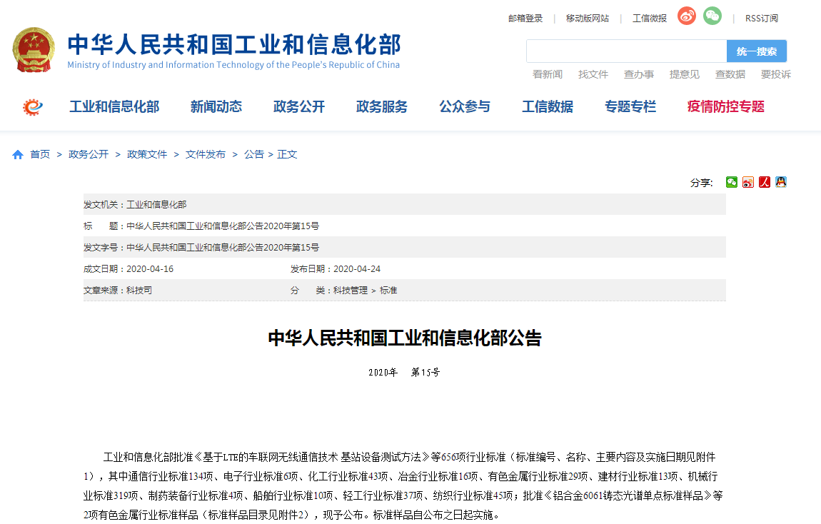 近日,工業和信息化部發布2020年第15號公告,批準《基于LTE的車聯網無線通信技術基站設備測試方法》等656項行業標準,其中涉及建材行業標準13項,由中國建材工業出版社出版。