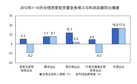 1-10月份,在規模以上工業企業中,國有及國有控股企業實現利潤11270億元,同比下降9.2%;集體企業實現利潤630億元,同比增長8.1%;股份制企業實現利潤23526億元,同比增長2%;外商及港澳臺商投資企業實現利潤9195億元,同比下降9.2%;私營企業實現利潤12623億元,同比增長17%。