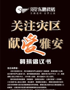 與此同時,東鵬陶瓷在終端旗艦店發起了愛心捐贈活動,集合東鵬人和東鵬消費者的愛心,收集捐贈的物資和善款發往雅安市民政局。此外,惠達衛浴宣布將捐款50萬至四川省慈善總會,支持和幫助災區人民。