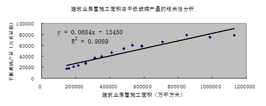 通過線性回歸,其結果表明,在其他條件不變時,建筑業房屋施工面積每增加1萬平方米,平板玻璃產量將增加684重量箱。