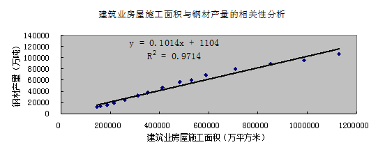 圖3是1999~2013年間鋼材產量與建筑業房屋施工面積的二維散點圖以及回歸的擬合趨勢線。其斜率為正,說明鋼材產量與建筑業房屋施工面積存在顯著(判斷系數R2=0.9714)的正相關關系,但其相關程度低于水泥制造業,而高于平板玻璃制造業。