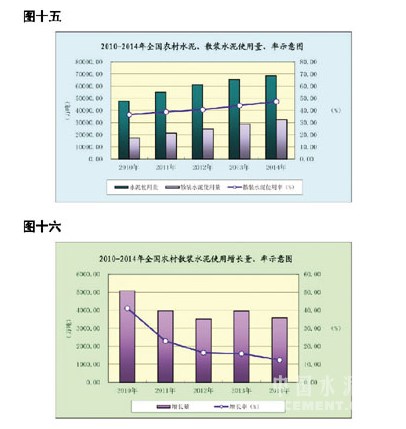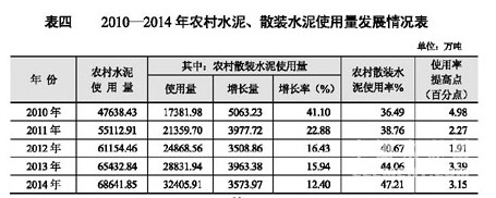 2014年農(nóng)村使用水泥總量為6.86億噸,其中散裝水泥使用量為3.24億噸(包括:農(nóng)村預(yù)拌混凝土使用1.26億噸,水泥制品使用0.65億噸),同比增加0.36億噸,增長(zhǎng)12.4%;使用率為47.21%,比上年44.06%提高3.15個(gè)百分點(diǎn)。占全國散裝水泥供應(yīng)量14.24億噸的22.76%。