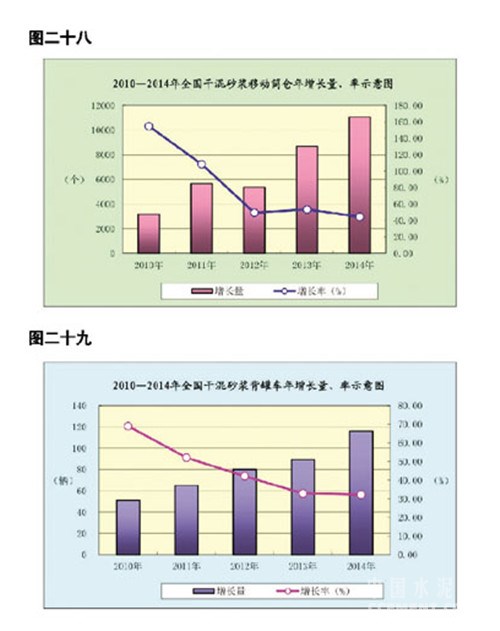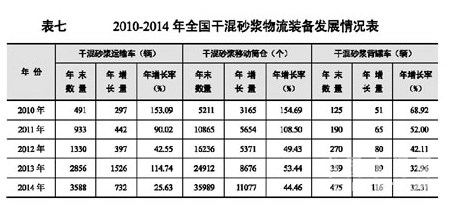 2014年末全國擁有干混砂漿運(yùn)輸車3588輛,同比增加732輛,增長(zhǎng) 25.63%;設(shè)計(jì)裝載量為9.99萬噸,同比增加1.76萬噸,增長(zhǎng)21.45%;有干混砂漿移動(dòng)筒倉3.6萬個(gè),本年增加1.11萬個(gè),增長(zhǎng)44.46%,設(shè)計(jì)容量107萬噸,增加33萬噸,增長(zhǎng)44.19%;有干混砂漿背罐車475輛,同比增加116輛,增長(zhǎng)32.31%,設(shè)計(jì)容量6135噸,同比增加921噸,增長(zhǎng)17.66%。