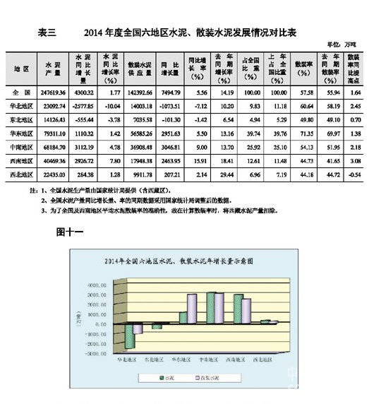 2010-2014年三部區(qū)水泥產(chǎn)量、增長(zhǎng)量、增長(zhǎng)率的發(fā)展情況。2014年三部區(qū)水泥、散裝水泥同比增長(zhǎng)量對(duì)比。