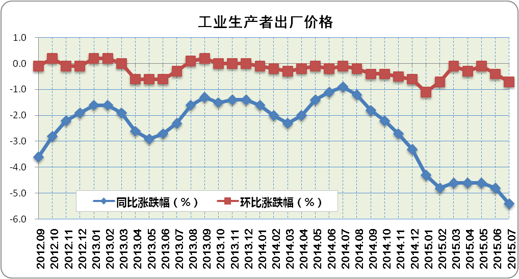 2015 年 7 月份,全國工業生產者出廠價格環比下降 0.7% ,同比下降 5.4% 。工業生產者購進價格環比下降 0.6% ,同比下降 6.1% 。 1-7 月平均,工業生產者出廠價格同比下降 4.7% ,工業生產者購進價格同比下降 5.6% 。
