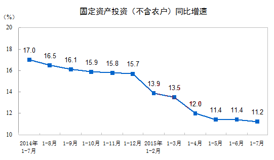 2015年1-7月份,全國固定資產(chǎn)投資(不含農(nóng)戶)288,469億元,同比名義增長11.2%,增速比1-6月份回落0.2個(gè)百分點(diǎn)。從環(huán)比看,7月份固定資產(chǎn)投資(不含農(nóng)戶)增長0.75%。