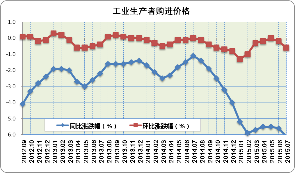 2015 年 7 月份,全國工業生產者出廠價格環比下降 0.7% ,同比下降 5.4% 。工業生產者購進價格環比下降 0.6% ,同比下降 6.1% 。 1-7 月平均,工業生產者出廠價格同比下降 4.7% ,工業生產者購進價格同比下降 5.6% 。
