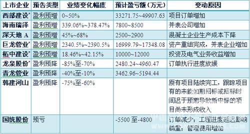 ??商品混凝土企業上市公司西部建設、海南瑞澤和深天地預計2015年盈利均實現同比增加,而制品企業中只有巨龍管業和柘中建設預期實現盈利增長,國統股份預計虧損,其余三個企業包括2015年新進入A股市場的韓建河山均為盈利同比下降。