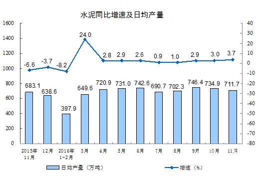 據統計局網站消息,1-11月份,規模以上工業增加值同比增長6.0%。11月份水泥產量21351萬噸,增長3.7%,去年同期為下降6.6%。1-11月份,全國水泥產量220328萬噸,增長2.7%,去年同期為下滑5.1%。 |