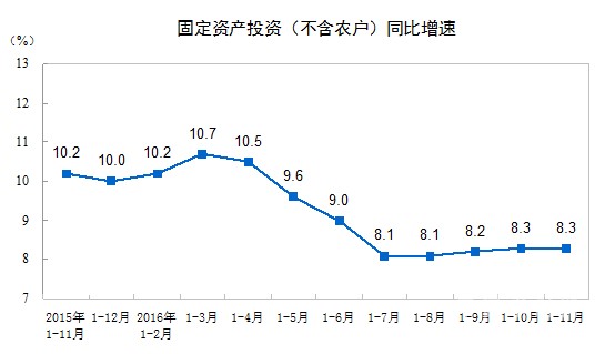 ??統計局數據顯示:2016年1-11月份,全國固定資產投資(不含農戶)538548億元,同比名義增長8.3%,增速與1-10月份持平。從環比速度看,11月份固定資產投資(不含農戶)增長0.54%。