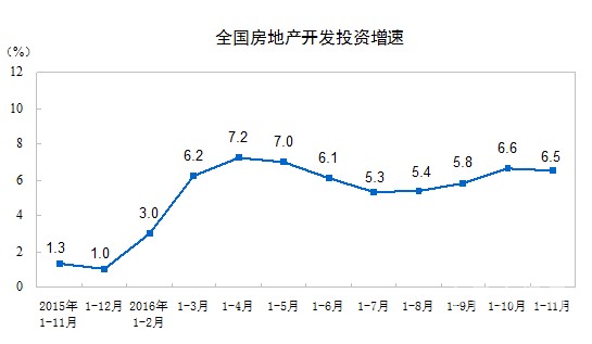 ![]() ??房地產開發投資增速小幅回落。2016年1~11月份,全國房地產開發投資93387億元,同比名義增長6.5%,增速比1-10月份回落0.1個百分點。其中,住宅投資62588億元,增長6.0%,增速提高0.1個百分點。住宅投資占房地產開發投資的比重為67.0%。