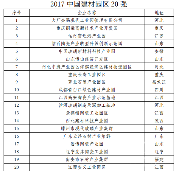 近年來,我國通過政府引導和市場化等多種形式,建成了一批具有一定特色、規模、集群化的建材產業園區,并吸引了一批產業領軍企業和領先技術進駐相關園區,為支撐地方、特別是縣域經濟發展發揮了重要作用。工業園區的建設與發展已經成為我國建材工業主流發展模式之一,成為政府規范、引導建材行業科學規劃、合理布局、嚴格安全準入的重要發展方向,也是推動建材行業綠色發展的重要手段。為了更好地為建材產業園區科學決策、合理規劃、定量管理、綠色發展等提供對標信息,加快推動產業示范園區品牌建設,為政府和投資機構決策提供數據支撐,中國建筑材料企業管理協會與中國建筑材料工業規劃研究院聯合開展了中國建材園區 20 強發布活動,通過企業申報、公開信息采集、深入調查、核查分析等多種渠道,在全面、系統分析的基礎上,按照入圍條件和評價準則確定了“2017 中國建材園區 20強,現予以公布(見附件)。希望建材園區堅持以科學發展觀為統領,以供給側結構性改革為指導思想,以綠色環保節能、技術先進、產業前瞻為發展方向,推動建材園區健康、良性發展。