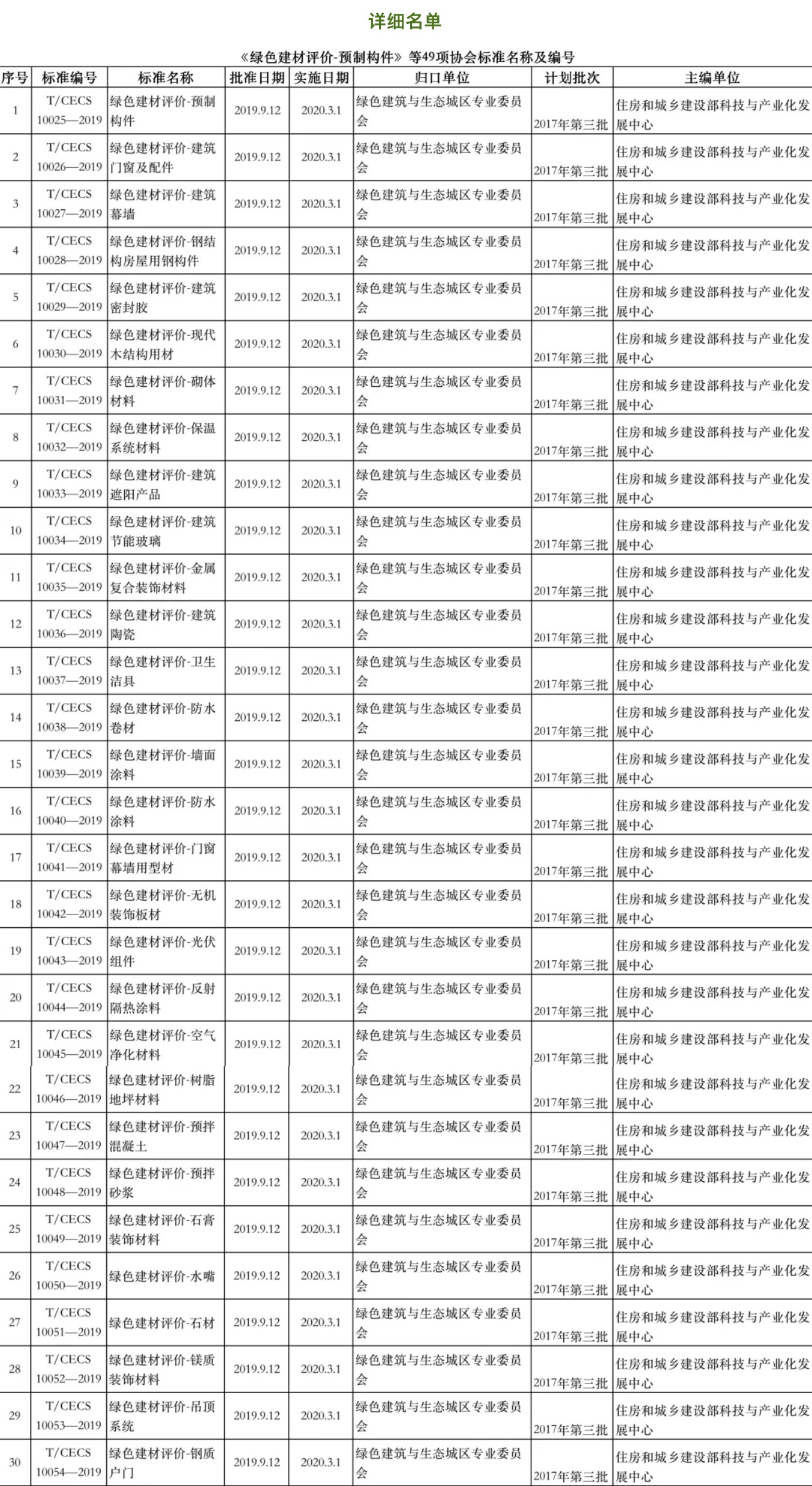 根據中國工程建設標準化協會《關于印發<中國工程建設標準化協會2017年第三批產品標準試點項目計劃>的通知》(建標協字〔2017〕034號)的要求,由住房和城鄉建設部科技與產業化發展中心等單位編制的《綠色建材評價 預制構件》等49項協會標準,經CECS綠色建筑與生態城區專業委員會組織審查,于2019年9月12日發布,2020年3月1日起施行,標準名稱及編號詳情見附件。其中,北京國建聯信認證中心有限公司牽頭編制《綠色建材評價 預拌砂漿》、《綠色建材評價 預拌混凝土》、《綠色建材評價 混凝土外加劑》、《綠色建材評價 石膏裝飾材料》、《綠色建材評價 石材》和《綠色建材評價 水嘴》等6項綠色建材標準。