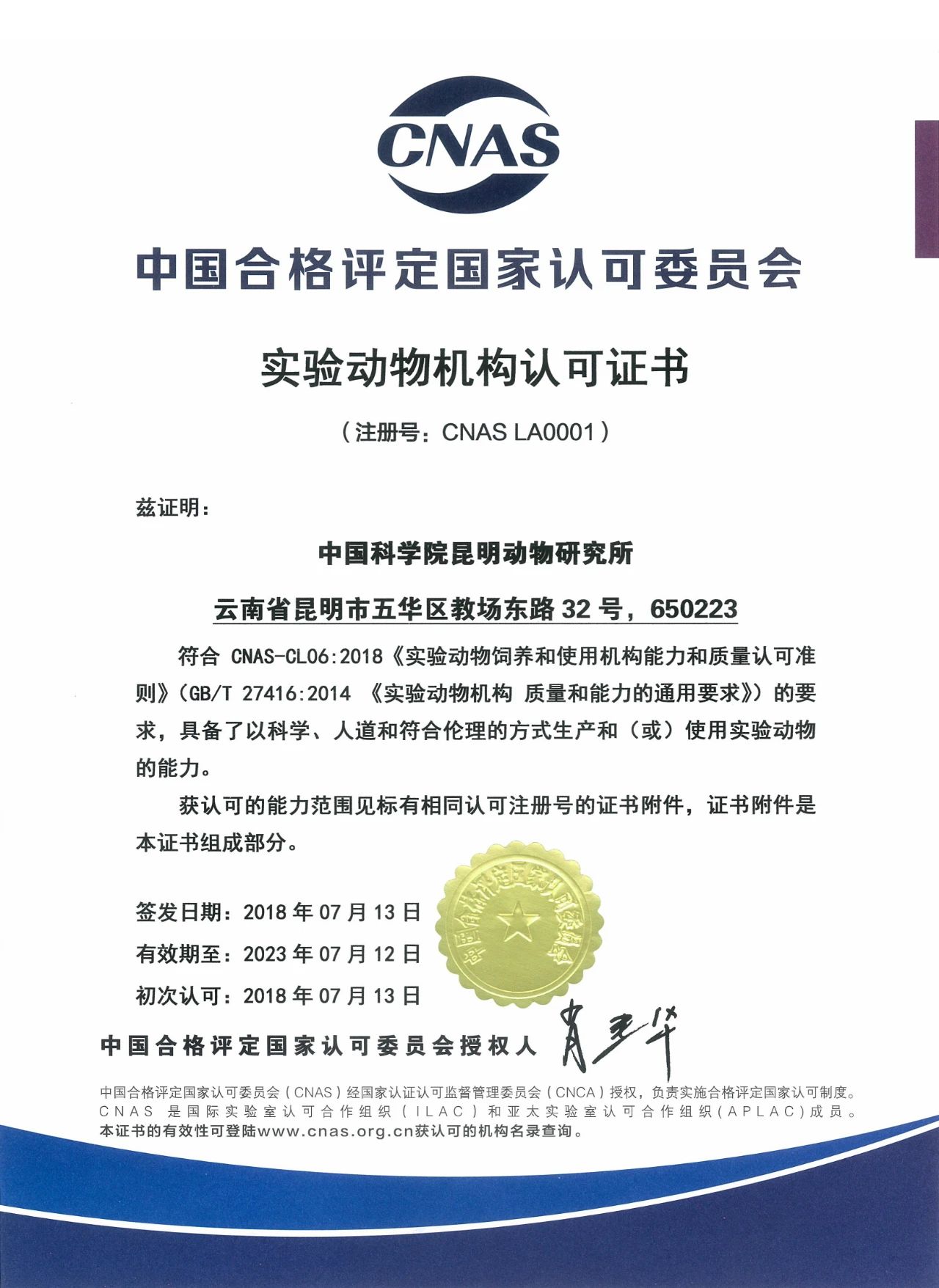 2018年7月13日,中國合格評定國家認可委員會(CNAS)為中國科學院昆明動物研究所(以下簡稱昆明動物研究所)頒發了我國第一張實驗動物機構認可證書。這標志著我國自主研發、創新建立的實驗動物機構認可制度正式實施。