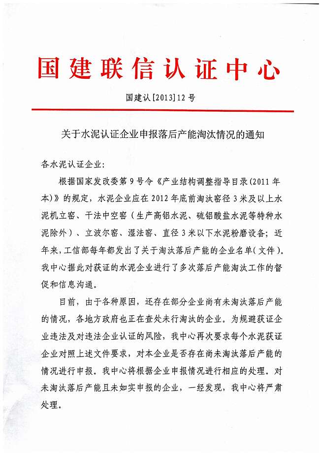 關(guān)于水泥認(rèn)證企業(yè)申報(bào)落后產(chǎn)能淘汰情況的通知