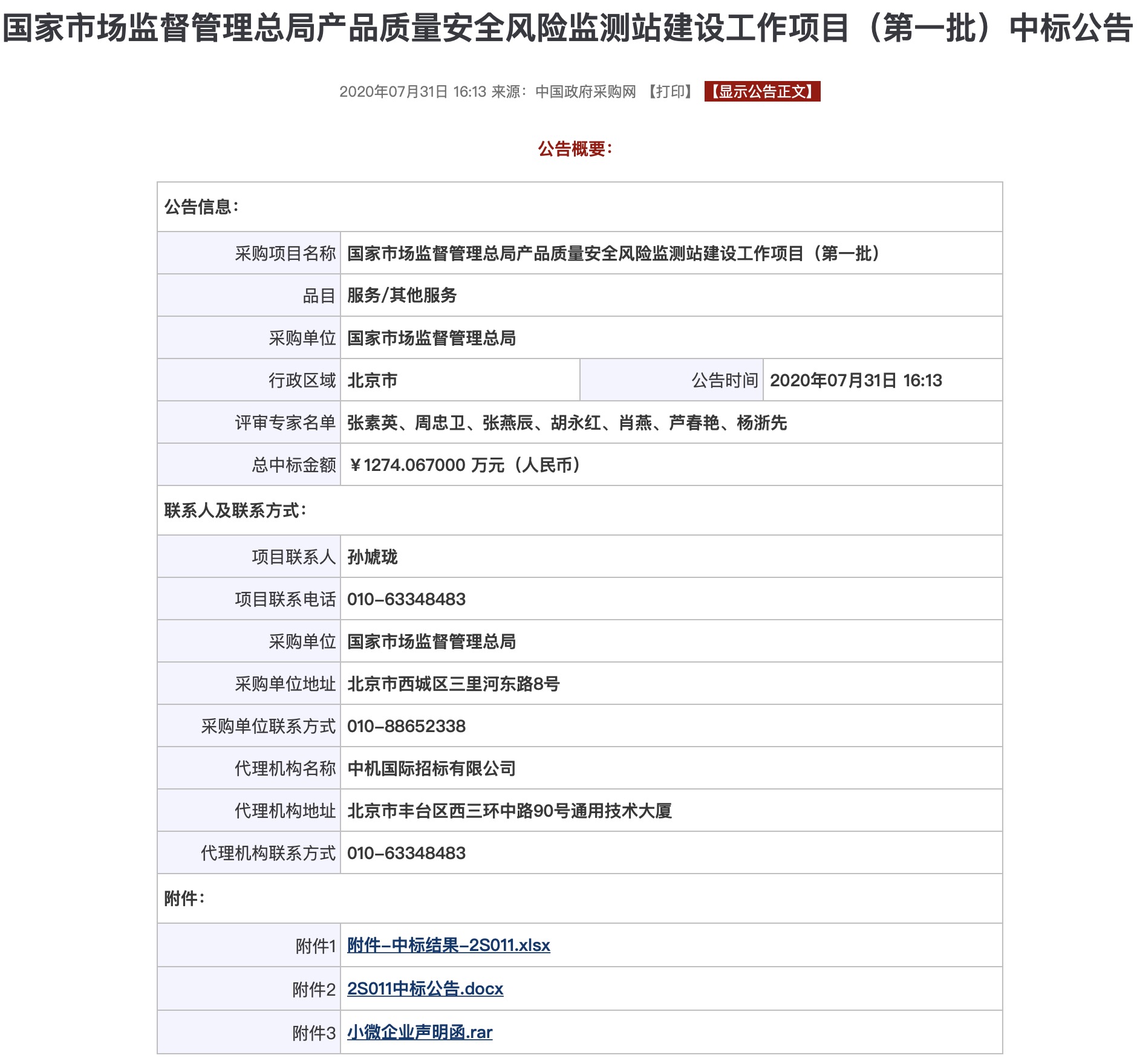 2020年7月31日,中國政府采購網中國政府購買服務信息平臺公布了“國家市場監督管理總局產品質量安全風險監測站建設工作項目(第一批)中標公告”,建材工業質量認證管理中心分別中標“建筑防水卷材產品”、“砂石產品”兩個項目。