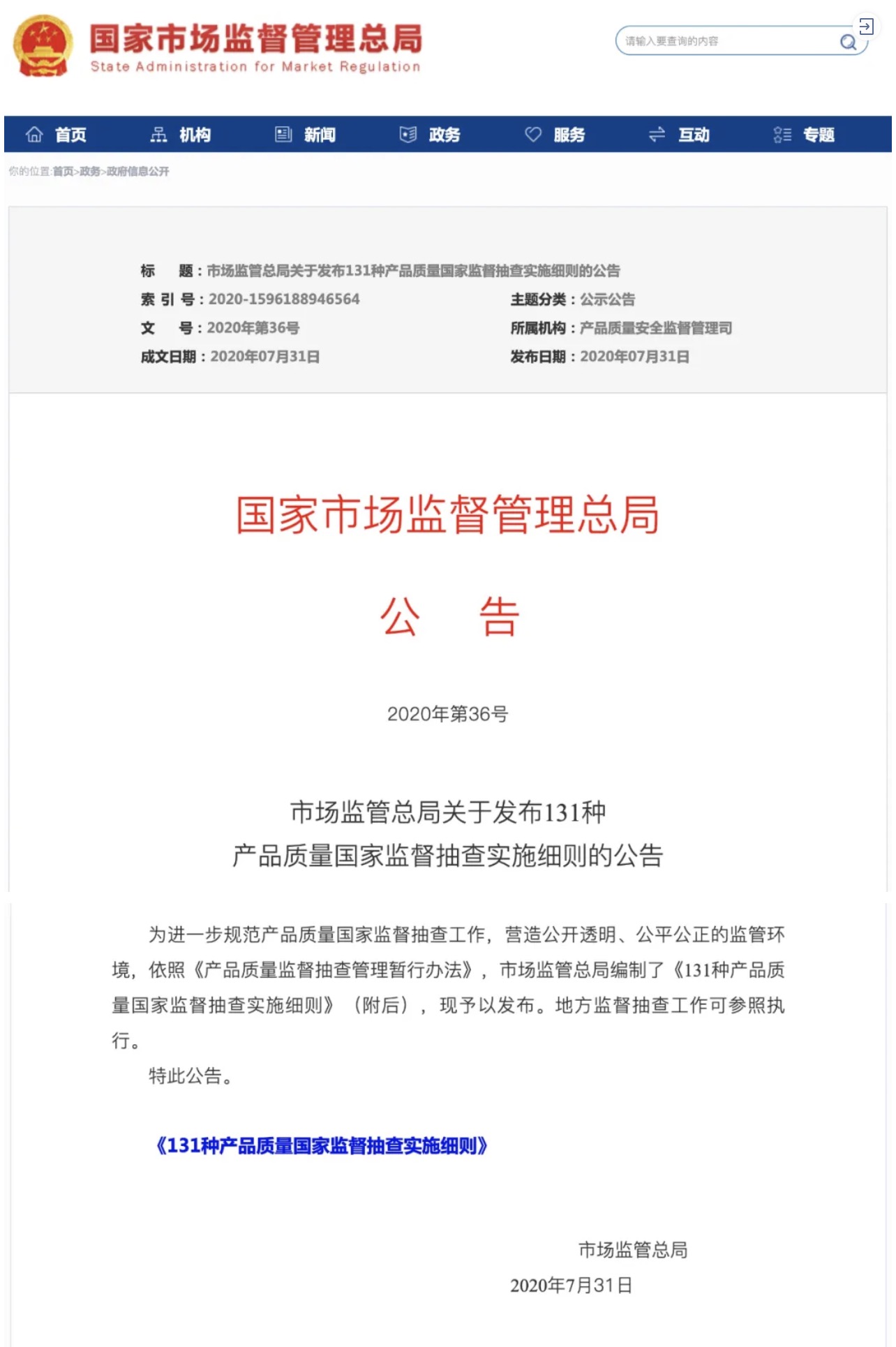 7月31日,國家市場監督管理總局發布《131種產品質量國家監督抽查實細則》,稱為進一步規范產品質量國家監督抽查工作,營造公開透明、公平公正的監管環境,依照《產品質量監督抽查管理暫行辦法》,市場監管總局編制了《131種產品質量國家監督抽查實施細則》,其中包括《水泥產品質量國家監督抽查實施細則》。