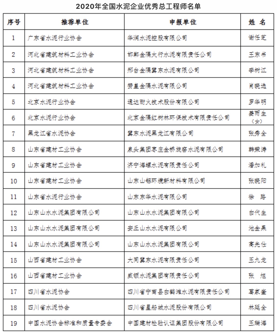 為全方位提升水泥產業的技術裝備水平,實施水泥企業的進一步節能減排,使中國水泥技術裝備實現中國制造和中國創造并舉,達到國際領先水平,中國水泥協會于2020年2月開展了“2020年全國水泥企業優秀總工程師”評選活動。該項評選工作按照既定程序進行了評審、審定,并在中國水泥協會微信公眾號、數字水泥網進行了公示。