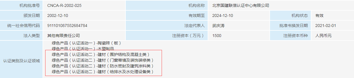 2021年2月1日,北京國建聯(lián)信認(rèn)證中心有限公司(簡稱國建認(rèn)證)率先獲批綠色建材產(chǎn)品認(rèn)證機(jī)構(gòu)資質(zhì),成為國內(nèi)首家綠色建材產(chǎn)品認(rèn)證機(jī)構(gòu)。認(rèn)證領(lǐng)域包括圍護(hù)結(jié)構(gòu)及混凝土類、門窗幕墻及裝飾裝修類、防水密封及建筑涂料類、給排水及水處理設(shè)備類四個大類。產(chǎn)品種類涉及34種建材產(chǎn)品,具體為:預(yù)制構(gòu)件、鋼結(jié)構(gòu)房屋用鋼構(gòu)件、現(xiàn)代木結(jié)構(gòu)用材、砌體材料、保溫系統(tǒng)材料、預(yù)拌混凝土、預(yù)拌砂漿、混凝土外加劑減水劑、建筑門窗及配件、建筑幕墻、建筑節(jié)能玻璃、建筑遮陽產(chǎn)品、門窗幕墻用型材、鋼質(zhì)戶門、金屬復(fù)合裝飾材料、建筑陶瓷、衛(wèi)生潔具、無機(jī)裝飾板材、石膏裝飾材料、石材、鎂質(zhì)裝飾材料、吊頂系統(tǒng)、集成墻面、紙面石膏板、建筑密封膠、防水卷材、防水涂料、墻面涂料、反射隔熱涂料、空氣凈化材料、樹脂地坪材料、水嘴、建筑用閥門、塑料管材管件。