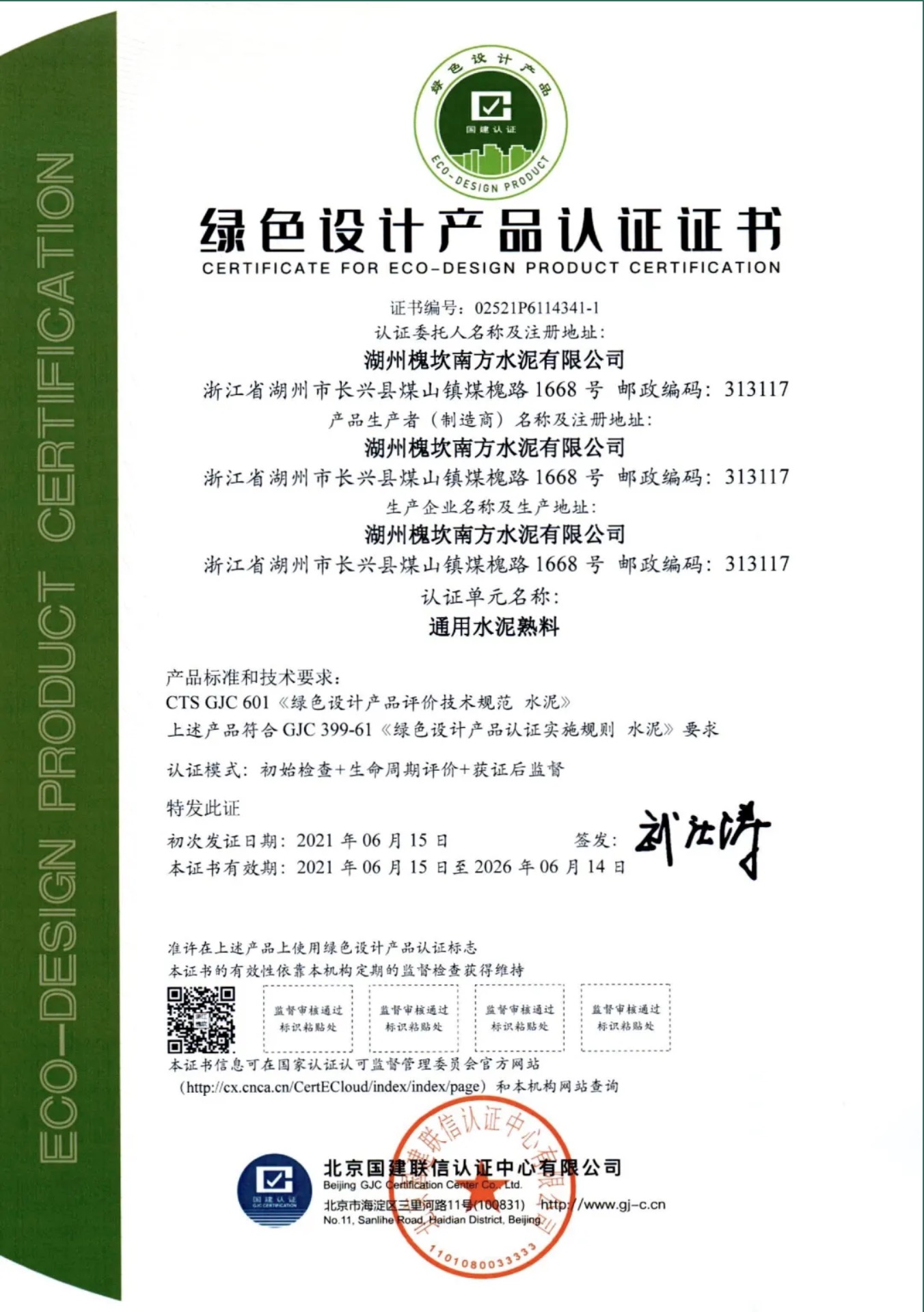 日前,北京國建聯信認證中心有限公司向中國建材最著名的智能工廠湖州槐坎南方水泥有限公司頒發了行業內首張綠色設計產品認證證書,在此,我們對湖州槐坎南方水泥有限公司表示熱烈的祝賀!