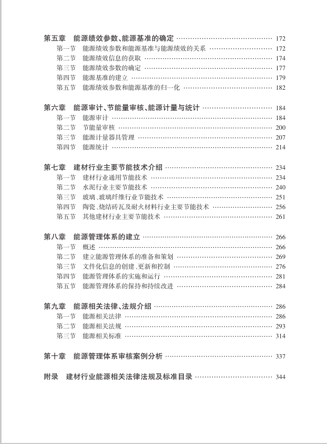 《建材行業能源管理體系教程》分為十個章節,分別介紹了能源管理體系的基礎知識、國內外能源發展的現狀及國際標準化組織和我國相關能源方面的系列標準;依據GB/T 23331《能源管理體系 要求及使用指南》(ISO 50001)標準,對標準條文理解、標準應用和審核要點進行了重點論述;依據ISO 19011《管理體系審核指南》,對組織內部審核方案的管理、實施審核及審核員的能力和評價進行了詳述。該教程還結合建材行業對能源評審、能源績效參數確定及能源基準的建立、能源審計、主要節能技術、能源相關法律法規和標準進行了重點介紹,以幫助建材企業建立、實施、保持和改進企業的能源管理體系、為能源管理人員系統地學習并成為建材行業注冊的內部能源管理體系審核員提供方法和路徑。