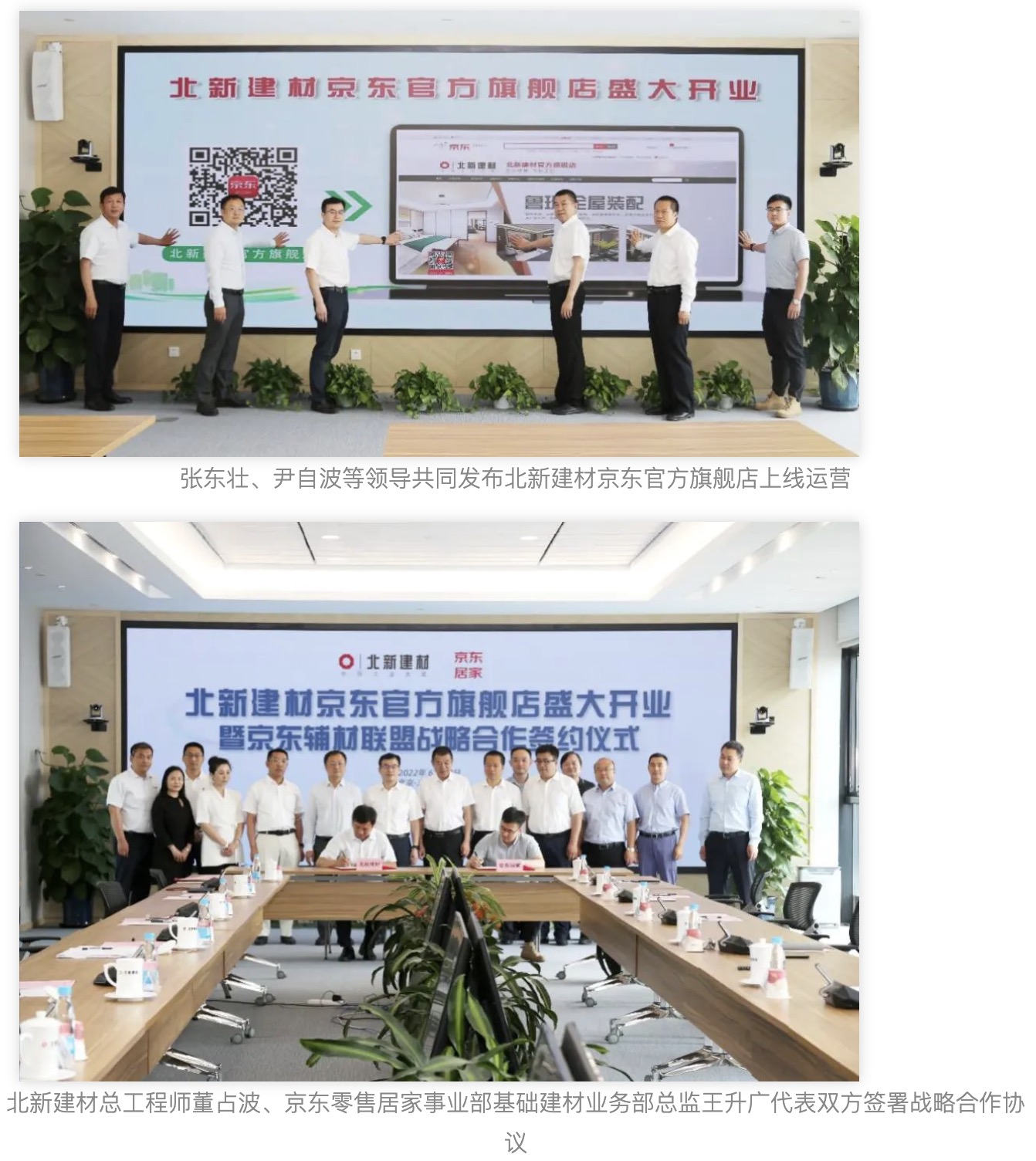 會議期間,張東壯代表推進組向北新建材授予“2022年綠色建材下鄉(xiāng)活動戰(zhàn)略合作伙伴”牌匾,與會代表共同見證北新建材京東官方旗艦店開業(yè)和京東輔材聯(lián)盟戰(zhàn)略合作簽約。