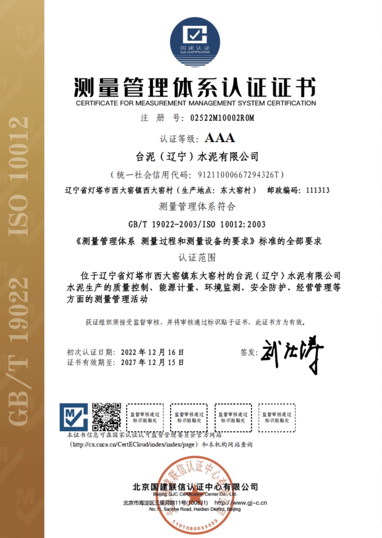 近日,北京國建聯信認證中心有限公司(簡稱“國建認證”)為臺泥(遼寧)水泥有限公司頒發了測量管理體系認證證書,這也是國建認證獲得測量管理體系認證資質后在水泥行業頒發的首張測量管理體系認證證書。
