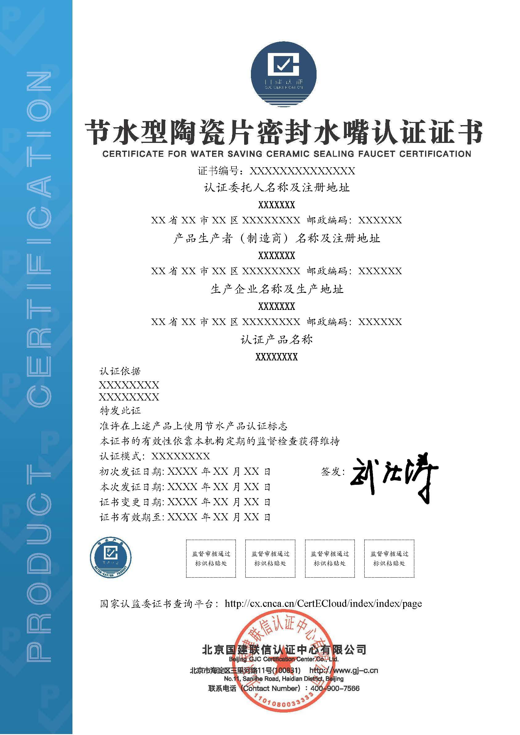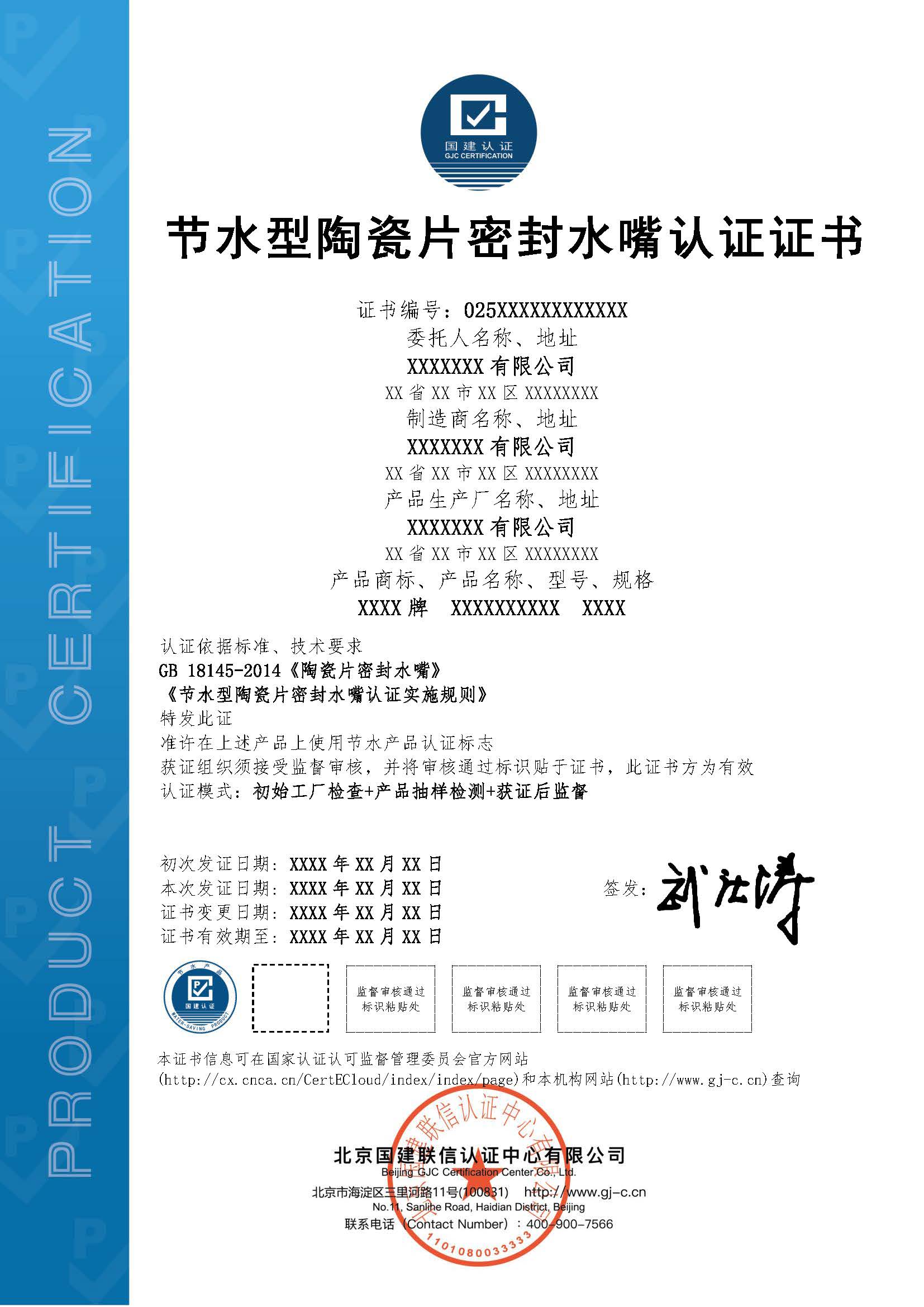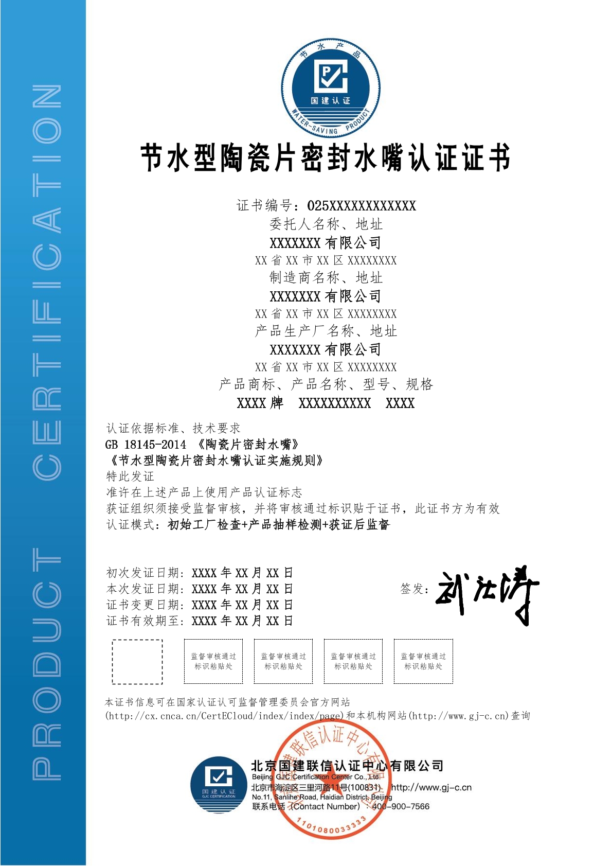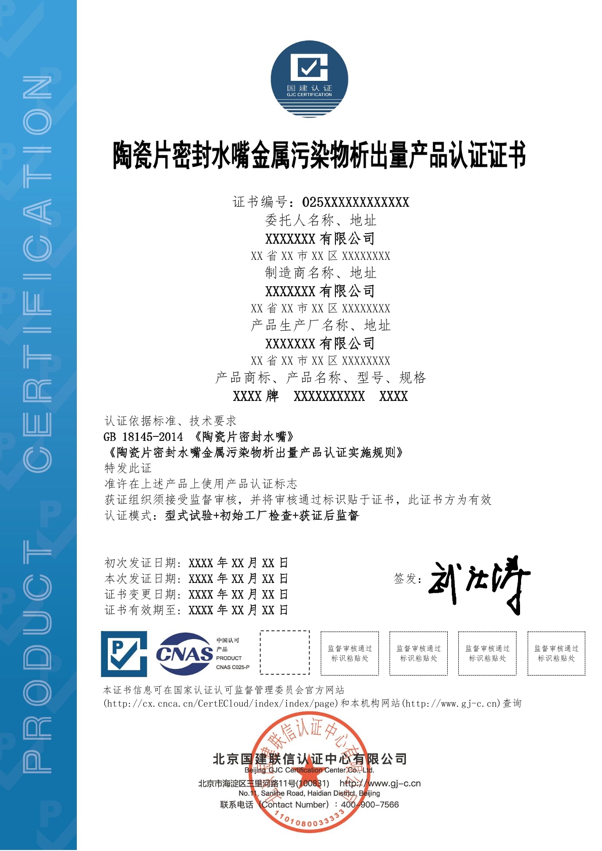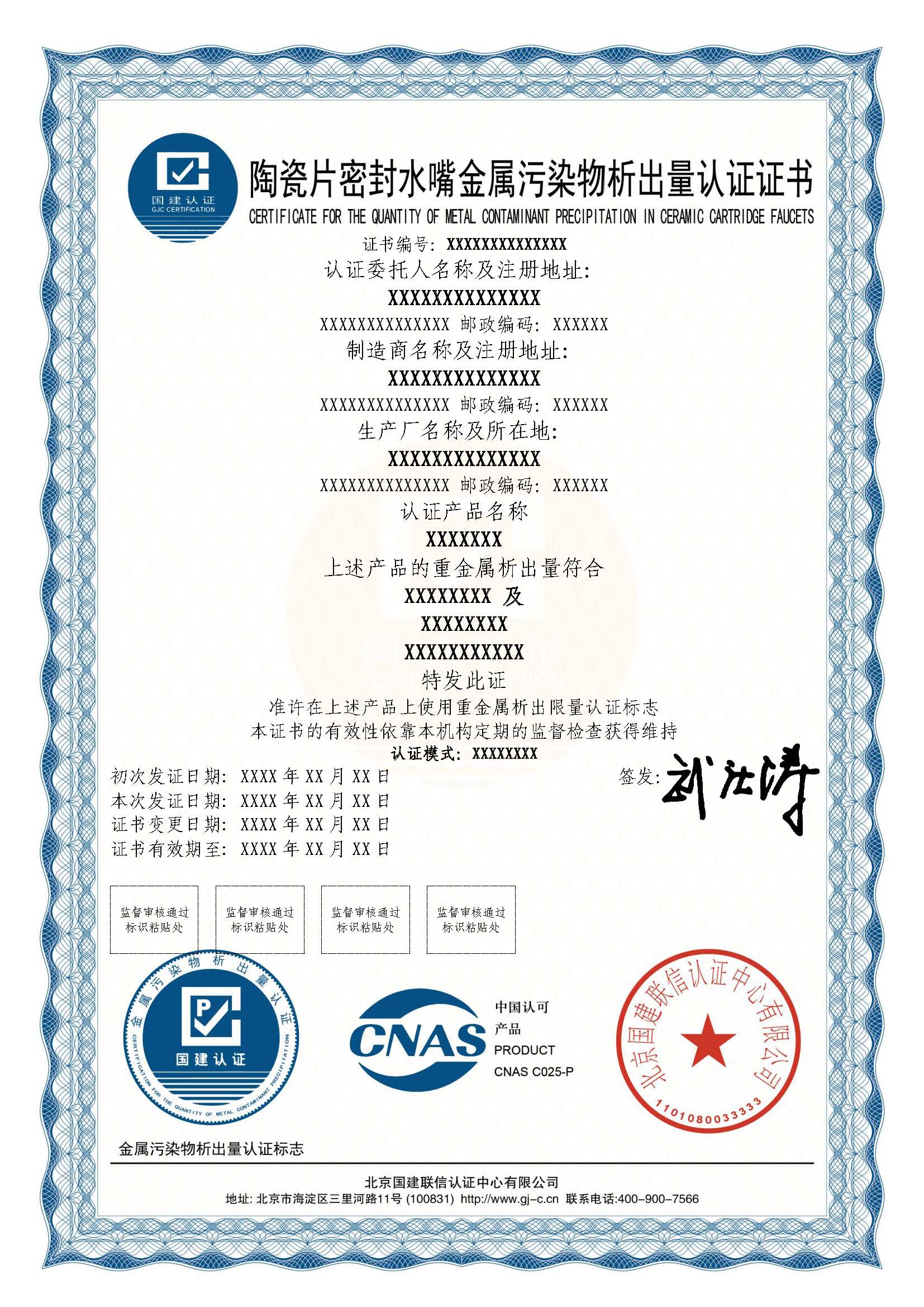 陶瓷片密封水嘴金屬污染物析出量產品認證證書 |