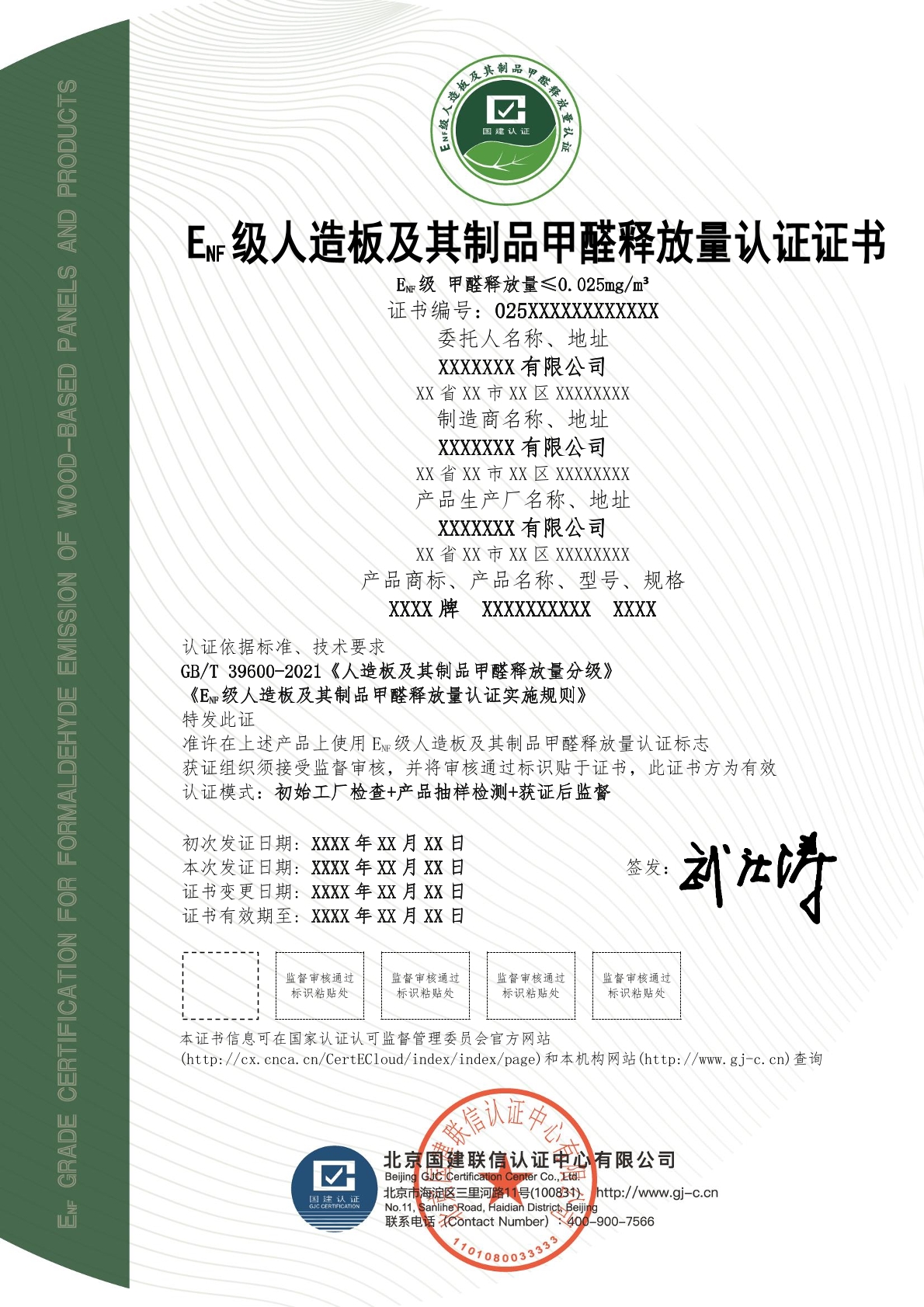 ENF級人造板及其制品甲醛釋放量認證證書 |