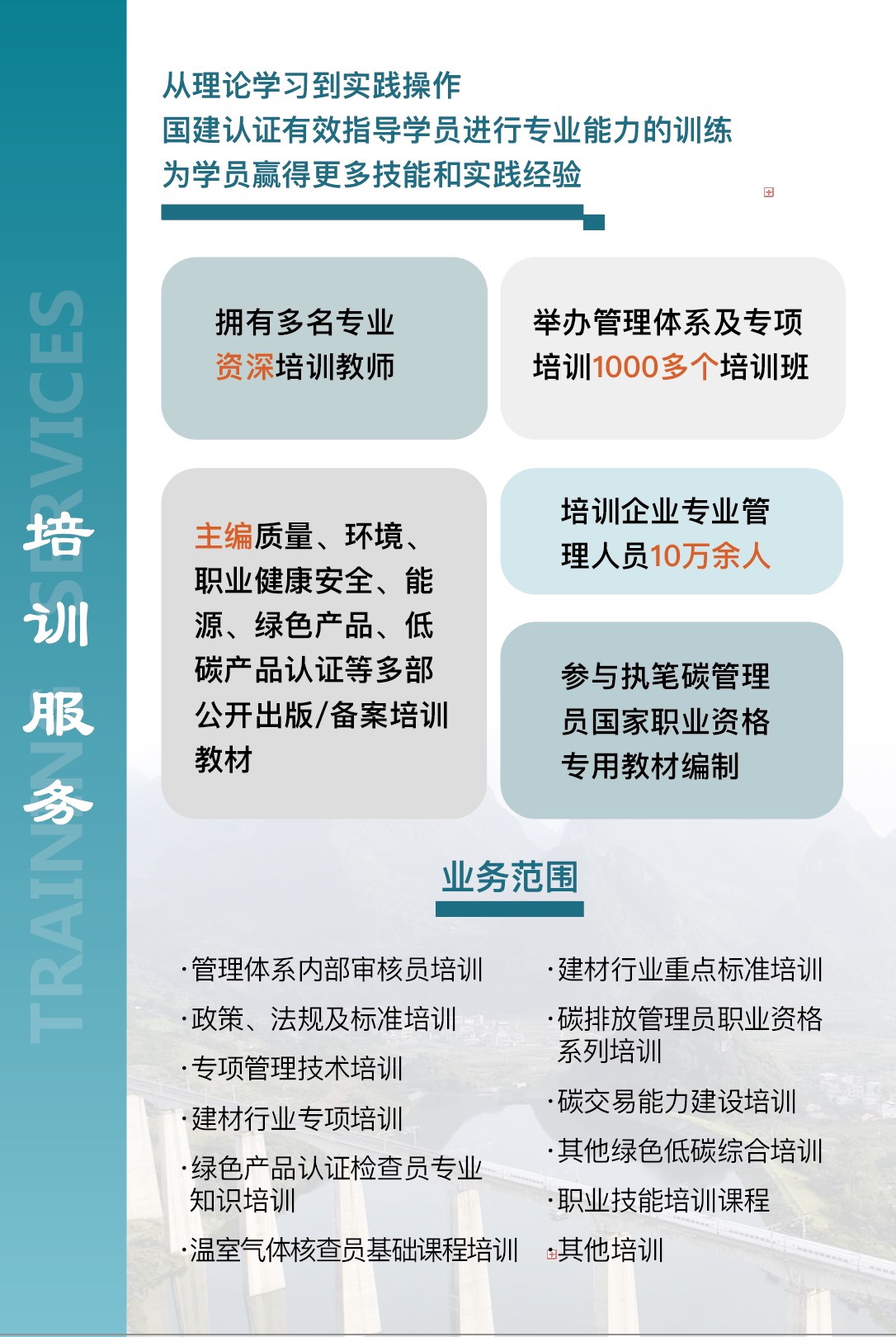 國建聯信認證中心為幫助組織持續提升管理績效而開展對外公開培訓,并突出“專業化、個性化”的服務理念。通過管理體系內部審核員培訓、專項管理技術培訓和法律法規標準培訓,可提高員工的綜合素質,為組織管理和認證方面的策劃、實施、保持與改進提供技術支持,增強組織的管理績效。中心對外培訓業務已歷經近30年發展歷史,期間有眾多企業的上萬人員接受了我中心的培訓。自上世紀90年代我國開始建立并實施認證制度以來,我中心做為原國家建材局指定機構,開發并實施了建材行業內部審核員注冊制度,編制了內審員專用教材,為建材行業企業采用國際管理體系標準并通過認證發揮了積極促進作用,同時普遍提升了建材行業企業的管理水平。通過近30年的發展,中心已經發展壯大成為擁有專業知識和豐富實踐經驗的教師隊伍,為企業實施了上千次的培訓授課,為企業培訓了大量管理人員。我中心將一如既往地服務于行業企業,與企業共同發展,共創輝煌!